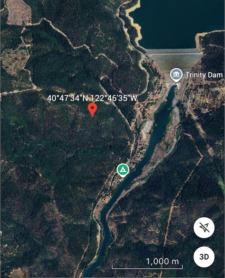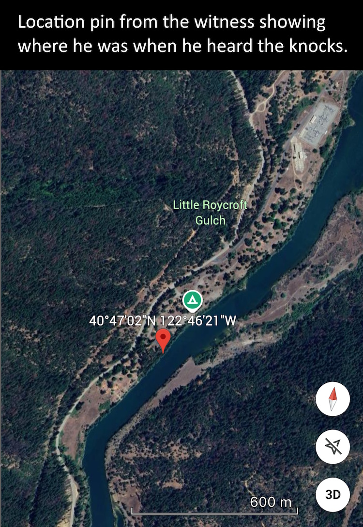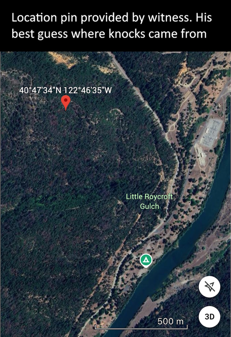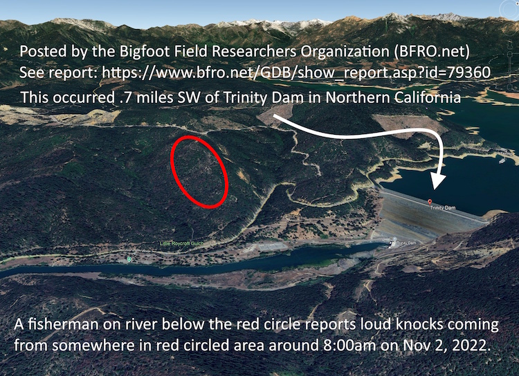 SEASON: Fall MONTH: November DATE: 5 STATE: California COUNTY: Trinity County LOCATION DETAILS: [See maps and captions below] NEAREST TOWN: Lewiston NEAREST ROAD: 299 OBSERVED: On November 5, 2022 between 8:05 and 8:08am I heard consecutive tree knocks. I was fishing alone at Lewiston Lake, fairly close to the Trinity Dam, California. Very foggy, and drizzle type rain that day. Starting at 8:05am; I heard one very loud, but distant knock of a tree, by another tree limb. That’s the only sound I could attribute it to. It came from far above my location; but in a later Google earth search, could find no houses anywhere near there. Two more solid knocks in close succession, about 1 minute or so after the first. Hard to tell time when you’re fishing; but I’m pretty sure of the approximation. I don’t think any human goes around knocking trees in the early November gloom. ALSO NOTICED: Just the time of day, season, and conditions were unusual for human activity OTHER WITNESSES: No OTHER STORIES: Yes; Many sightings in the area. Also has prolific deer population TIME AND CONDITIONS: 8:05-8:08am ENVIRONMENT: Reservoir on the backside of Dam. Very wooded area. Many steep hills