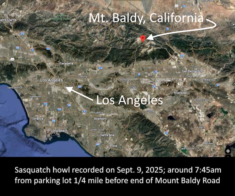 SEASON: Summer MONTH: September DATE: 9 STATE: California COUNTY: San Bernardino County LOCATION DETAILS: 34.26622° N, 117.62683° W NEAREST TOWN: Mt. Baldy NEAREST ROAD: Mt. Baldy Road Highway OBSERVED: On Tuesday 09/09/2025, I drove up to Manker Flats to hike the Mt. Baldy Bowl to Devil’s Backbone Trail. It was approximately 8am and The weather was approximately 55-60 degrees at the trailhead on Mt. Baldy road. I exited my jeep and walked to the back of it to prepare my gear for the long hike. As I was opening the tailgate on my jeep, I heard an extremely loud wail coming from what seemed like the end of the Mt. Baldy road which is approximately 1/4th of a mile north of where I was. The scream produced a strong emotional response from me and the sound went on for approximately 10-15 seconds. I captured a video that has a part of the scream and dogs from the 2 or 3 neighboring houses nearby.