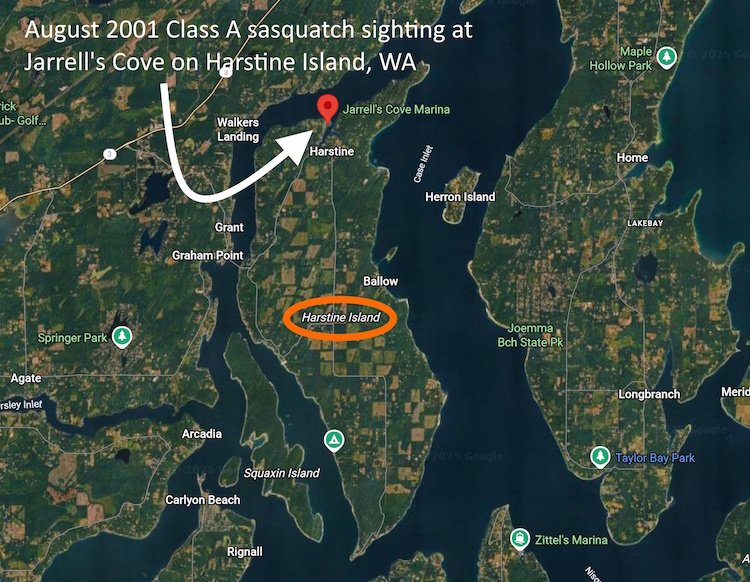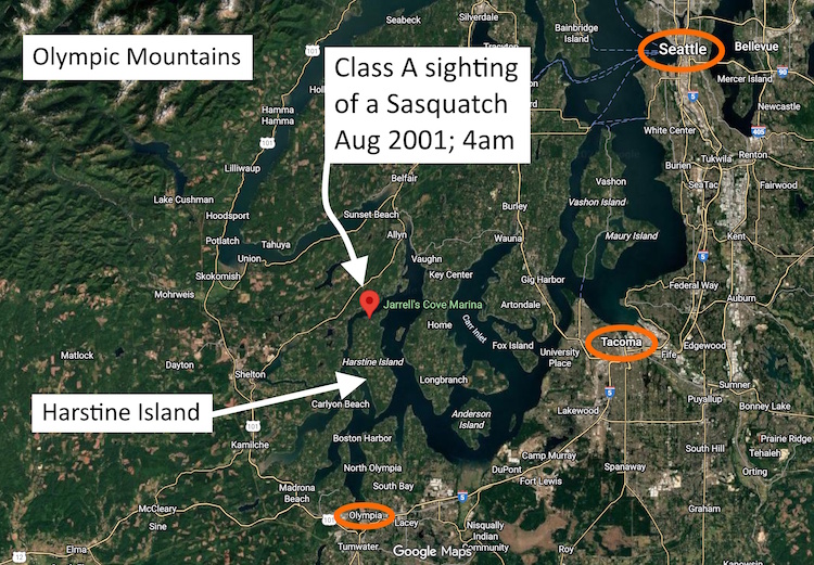Harstine Island is well known to have a population of sasquatches. The book “Visits from the Forest People” by Julie Scott was about frequent interaction with sasquatches at their home which is only about a mile away. There are other reports also.