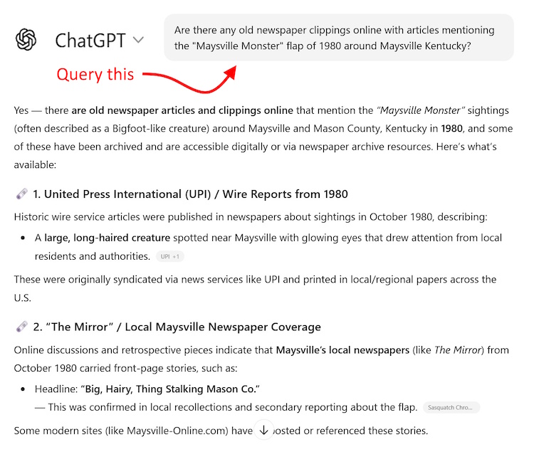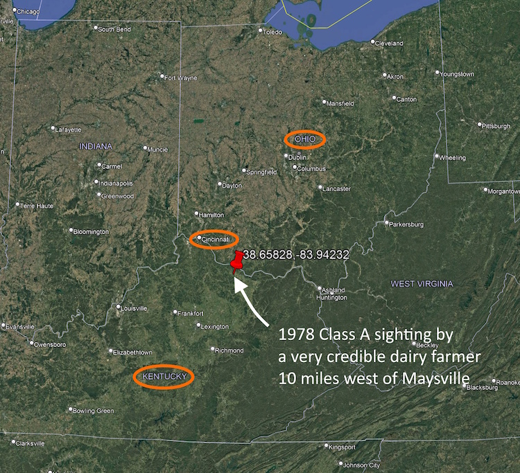 The time-frame: around the time of "Maysville Flap". Maysville is only 10 miles to the east from this sighting location. A "flap" is a cluster of sightings that occur in the same area during a particular time frame.