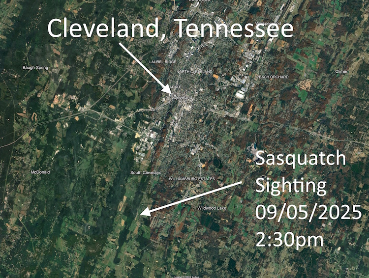 [Investigator MM notes: GPS: 35.088121, -84.907372 ] NEAREST TOWN: Cleveland NEAREST ROAD: Blue Springs Rd OBSERVED: We were driving across the RR tracks and it came out of the shadows of the trees to cross the tracks heading back toward Blue Springs. When we slowed to get a better look, it stopped and froze staring at us. We tried to turn around to see where it was going but it was gone when we got back.