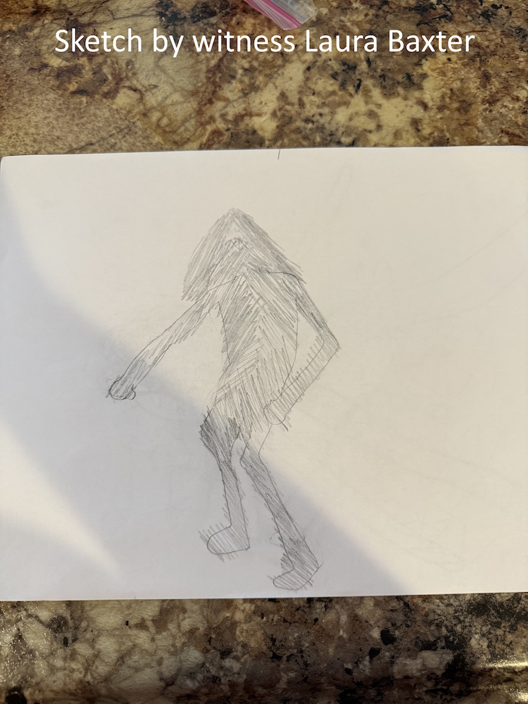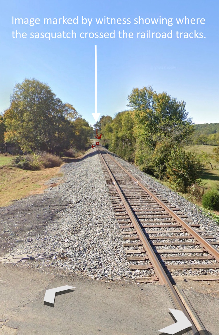 I spoke with both witnesses by phone. They are credible. They had a Class A daylight sight of a tall skinny sasquatch crossing the railroad tracks roughly 50 yards north of where Blue Springs Road crosses the tracks. The witness says she is not a very good artists but she drew this to give an idea of what she saw. She emphasized that it was very tall and lanky and covered with dark fur. It moved from the trees on the right side to the left. It stopped on the tracks for a few seconds, look in her direction, then continued moving toward the trees on the left. This happened in the afternoon on a cloudy, muggy September day.