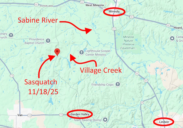 This location was very close to a tributary of the Sabine River. That will mean something to bigfoot researchers in Texas.
