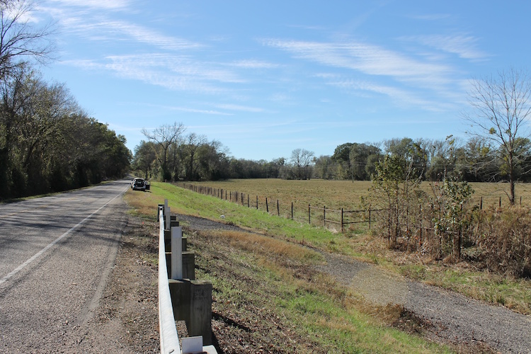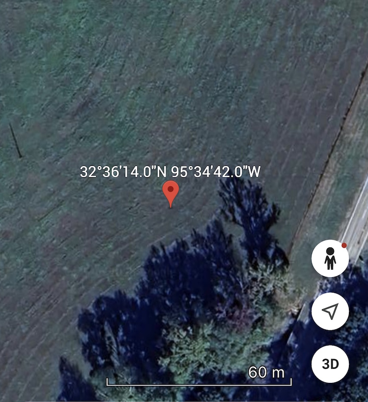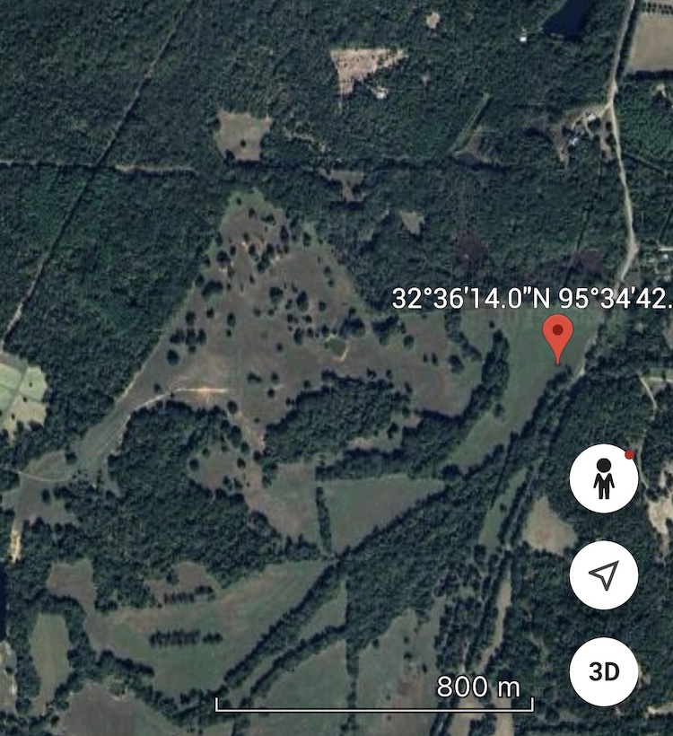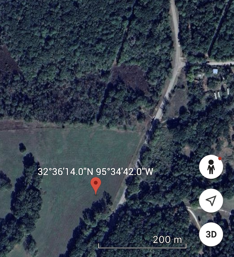 1) The location of the sighting is a large, open field along the west side of Texas Farm to Market (FM) Highway 1253, approximately 7.5 miles south of US Highway 80. Village Creek passes through the property within 200 yards of the sighting.