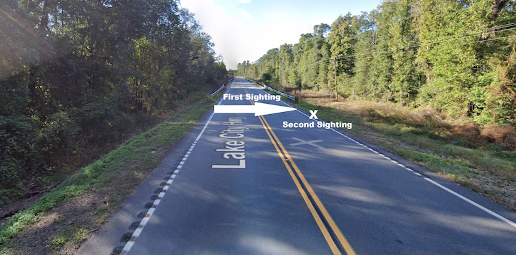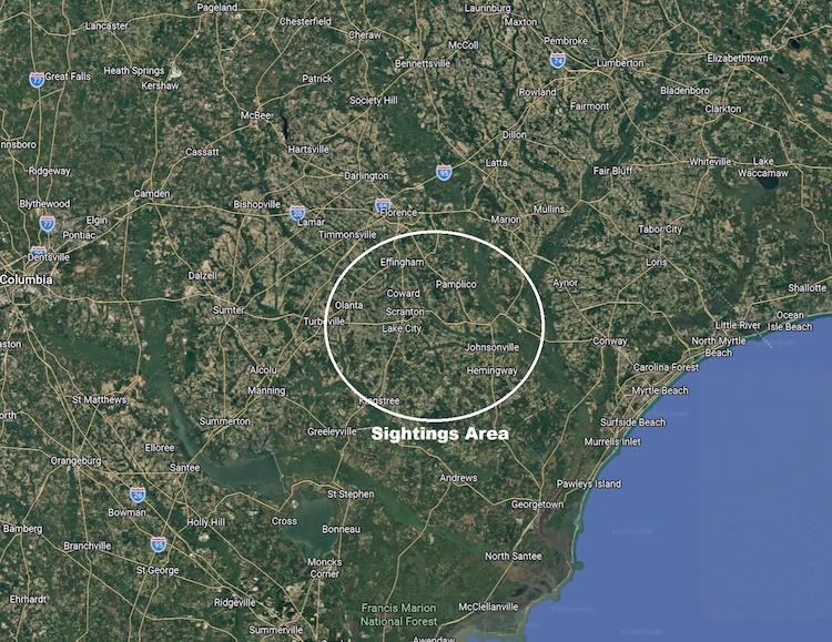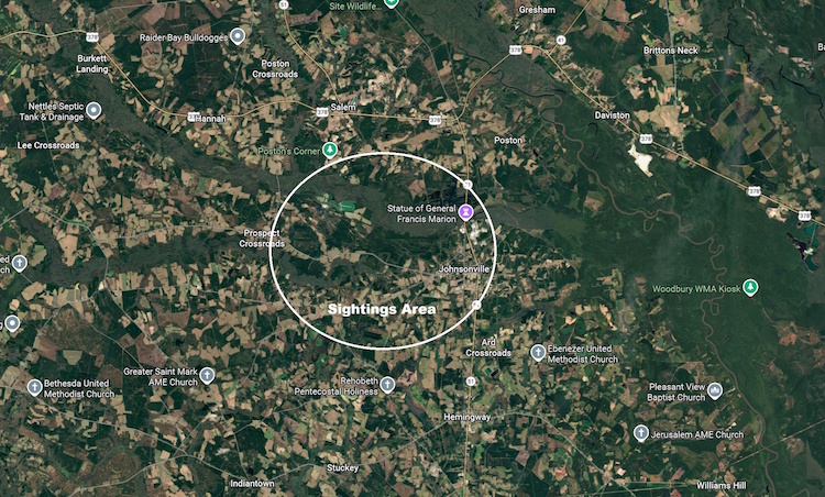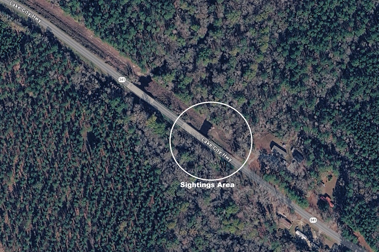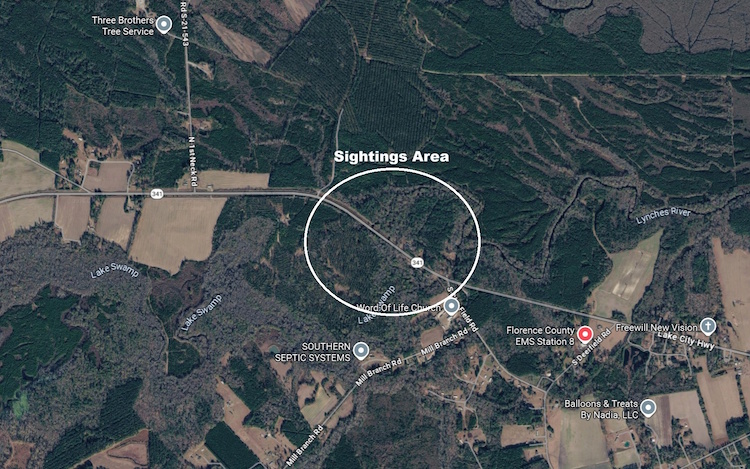 SEASON: Winter MONTH: January DATE: January 16 & 18 STATE: South Carolina COUNTY: Florence County LOCATION DETAILS: Approximately 3.1 miles west of the SC 41/51 and SC 341 intersection. NEAREST TOWN: Johnsonville SC NEAREST ROAD: SC 341 (Lake City Highway) OBSERVED: In the early afternoon on January 16, 2026, I was traveling west with a friend on SC 341 (Lake City Highway), going from Johnsonville, SC to Lake City, SC. As we approached the first of two bridges over Lynches River, my friend exclaimed, "Did you see that!" I turned my head to see what she had seen. My friend saw it better, but it was a bipedal being with black hair, quickly crossing the road, left to right, as we passed. It was about 6' tall and crossed the road in 3-4 steps, then went down a sharp embankment into a swampy pine forest thicket. We were surprised at the speed with which it crossed the road and disappeared into the pine forest.
