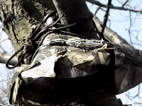 The following two pictures show how the mic is strapped to tree. The first one shows how the leather strap is used to strap to the tree trunk just underneath where a limb is branching out from the trunck. This is the best position to strap it because it allows you to point the funnel more veritically downward and while still enabling you to strap the mic tightly so it doesn't blow in the wind. Neither the mic nor the antenna wire should hang loose enough to blow in the wind, or else the signal from the mic won't be steady.
