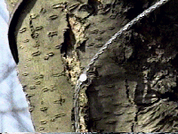 The next two pictures show how the antenna wire is affixed to the tree trunk. The first picture shows how I looped the antenna wire tightly around a nail to hold it steady. The nail itself was wrapped with a piece of electricians tape to help reduce the grounding effect of the nail-tree-ground path. The second picture shows the aligator clip on the far end of the antenna wire clamped to another nail which has been wrapped with electrician's tape.