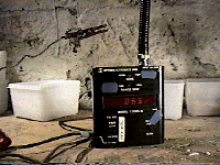 This last picture shows a frequency counter placed next to the antenna wire when it was still on the worktable. You'll need to buy or borrow one of these devices in order to tune the microphone to the proper frequency. The tuning screw is extremely sensitive and will jump from 80Mhz to 90Mhz with only a slight turn of the screw. You have to use extremely gentle turning movements to get the mic to a particular decimal frequency such as 87.5 Mhz.